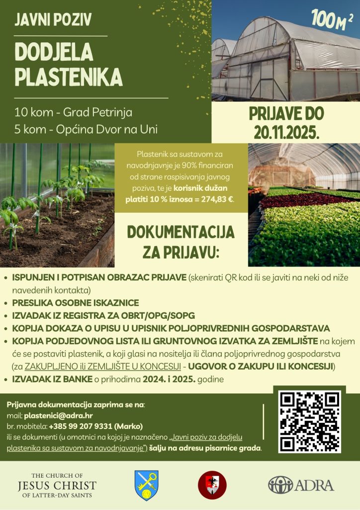 Objavljen je javni poziv za dodjelu plastenika s ciljem poticanja poljoprivredne proizvodnje i osnaživanja lokalne zajednice. U sklopu projekta dodjeljuje se ukupno 15 plastenika – 10 na području Grada Petrinje, te 5 na području Općine Dvor na Uni. Projekt se provodi u suradnji s The Church of Jesus Christ of Latter-day Saints, Gradom Petrinja i […]